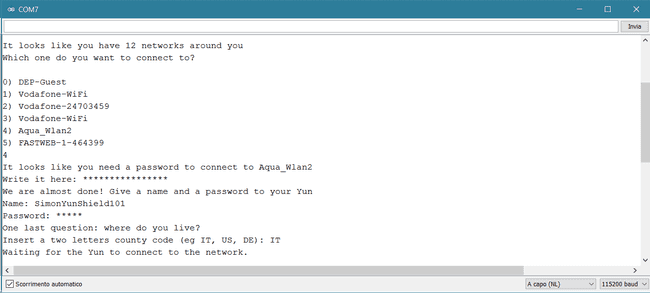 The blue LED on the shield will start to blink after a while; when the scanning process is over, the sketch will offer all the available APs in a numbered list. The time required to scan the network depends on the number of APs and their signal strength. You choose the AP to use typing in the input field the corresponding number. Please remember to enable "NewLine" in the Serial Monitor as End of Line.