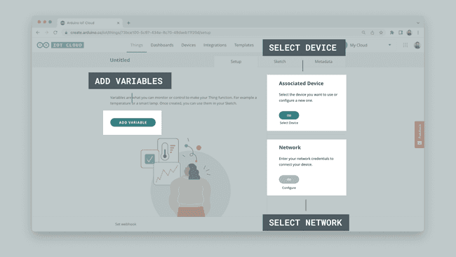 Now, we need to create the program for our Thing. First, let's head over to the "Sketch" tab in the Arduino Cloud. At the top, your board should be available in the dropdown menu by default.